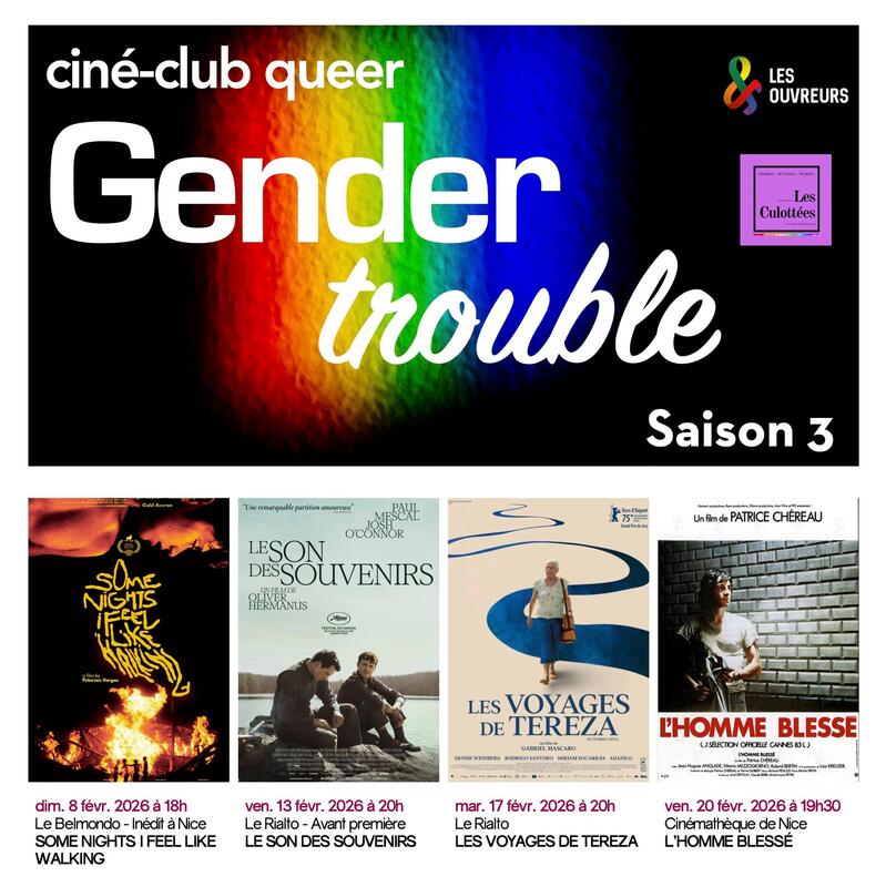 Rendez-vous unique dédié à la promotion du cinéma queer dans toute sa diversité, le ciné-club Gender Trouble propose à Nice des séances régulières au Cinéma Le Belmondo, le dimanche autour de 18h, et au Cinéma Le Rialto, le mardi autour de 20h.![]()