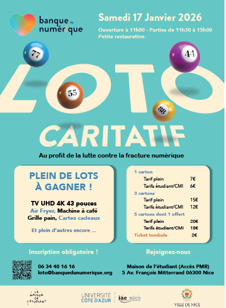 Les étudiants de l’IAE organisent le samedi 17 janvier 2026 à la Maison de l’Etudiant de 11h à 15h un loto caritatif et solidaire, ouvert à tous (familles, étudiants, seniors…), au profit de la Banque du numérique.