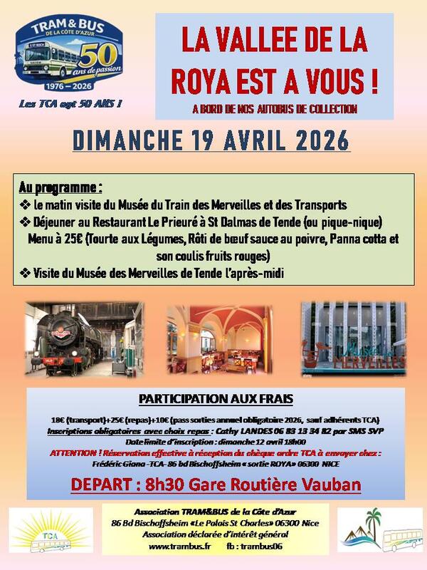 Participation aux frais : 18€ (transport) + 25€ (repas) + 10€ (pass sorties 2026) réservation effective à réception du chèque - ordre TCA
