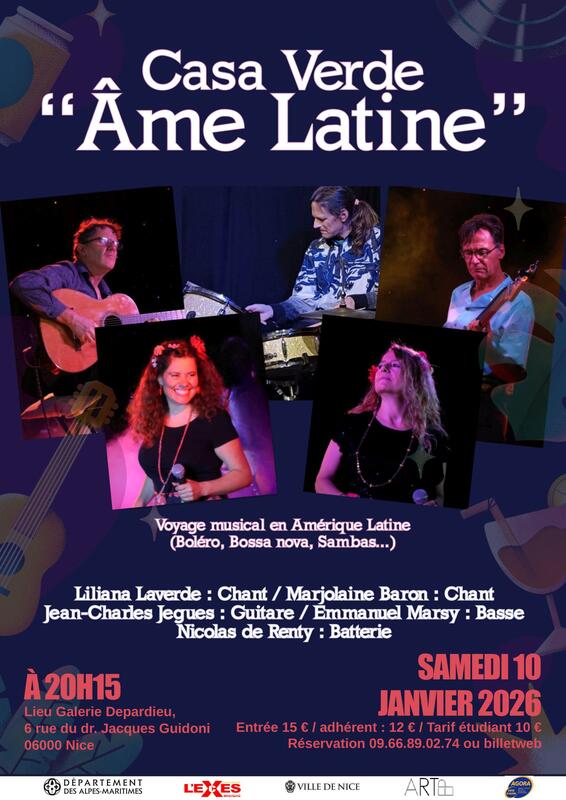 « Casa Verde » est un groupe de musique latino-américaine composé de cinq musiciens passionnés : deux chanteuses, un guitariste, un bassiste et un batteur. Basés dans le bassin grassois, nous sommes ravis de vous proposer une performance à La Galerie Depardieu.