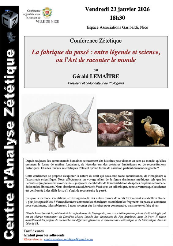 Cette conférence se propose d'explorer la nature du récit qui sous-tend toute connaissance, de l'imaginaire à l'exactitude scientifique. Nous effectuerons un voyage allant de la figure d'animaux mythiques tels que les licornes – qui pourraient avoir existé – jusqu'aux incertitudes de la reconstitution d'espèces disparues comme le dodo ou les dinosaures. Nous aborderons aussi Jurassic Park sous un œil critique, et nous verrons que la science est confrontée à des défis lorsqu'il s'agit de reconstruire le passé.