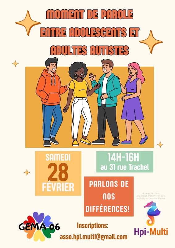 Le GEMA-06 et l'association HPI-Multi Intelligences proposent un groupe de parole entre ados et jeunes adultes autistes avec ou sans haut potentiel intellectuel pour parler de leurs différences.