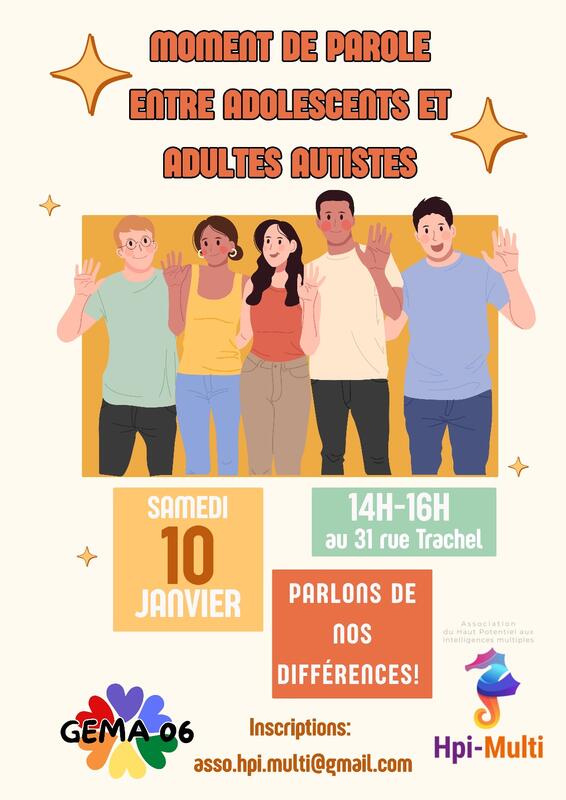 Le GEMA-06 et l'association HPI-Multi Intelligences proposent un groupe de parole entre ados et jeunes adultes autistes avec ou sans haut potentiel intellectuel pour parler de leurs différences.